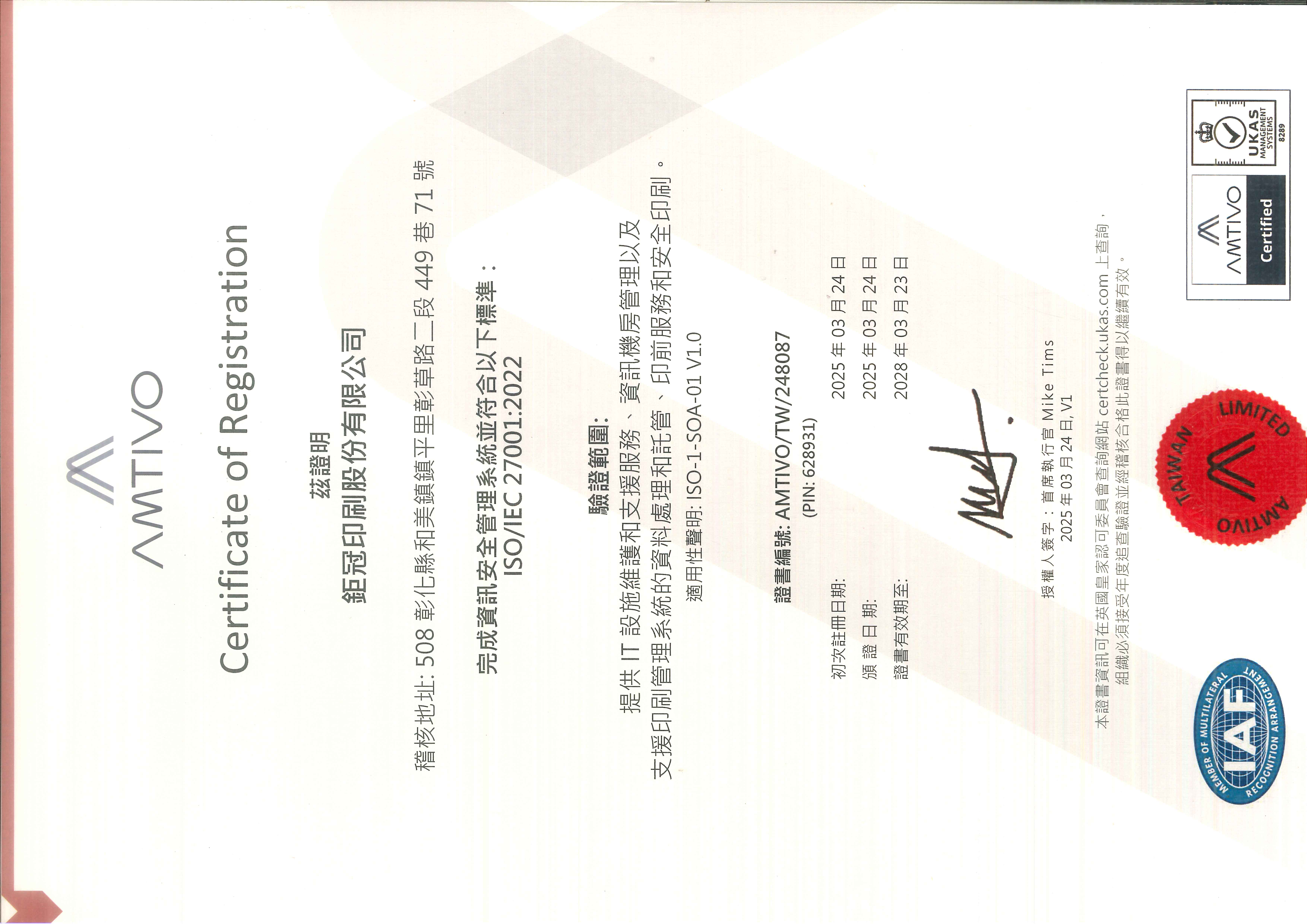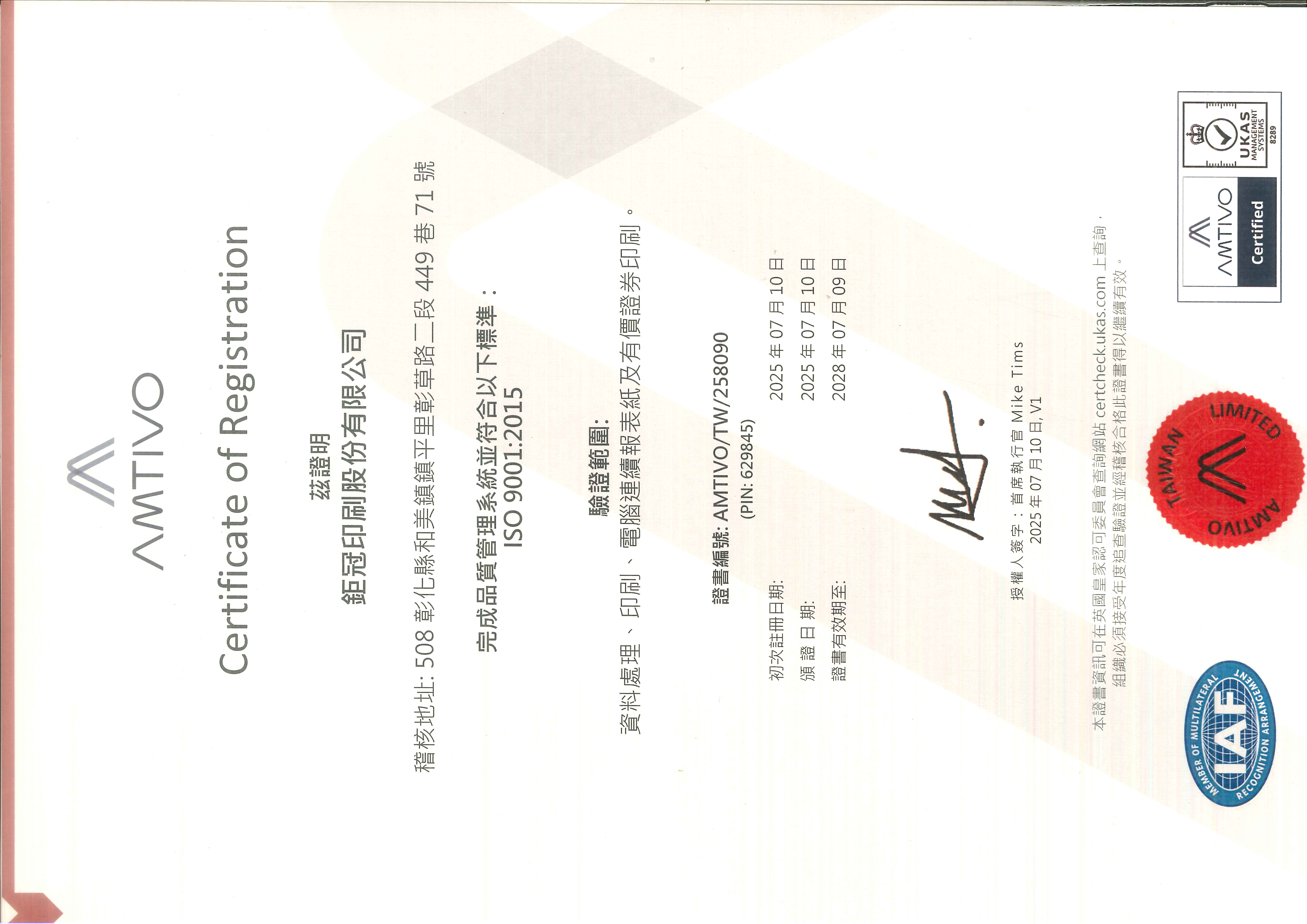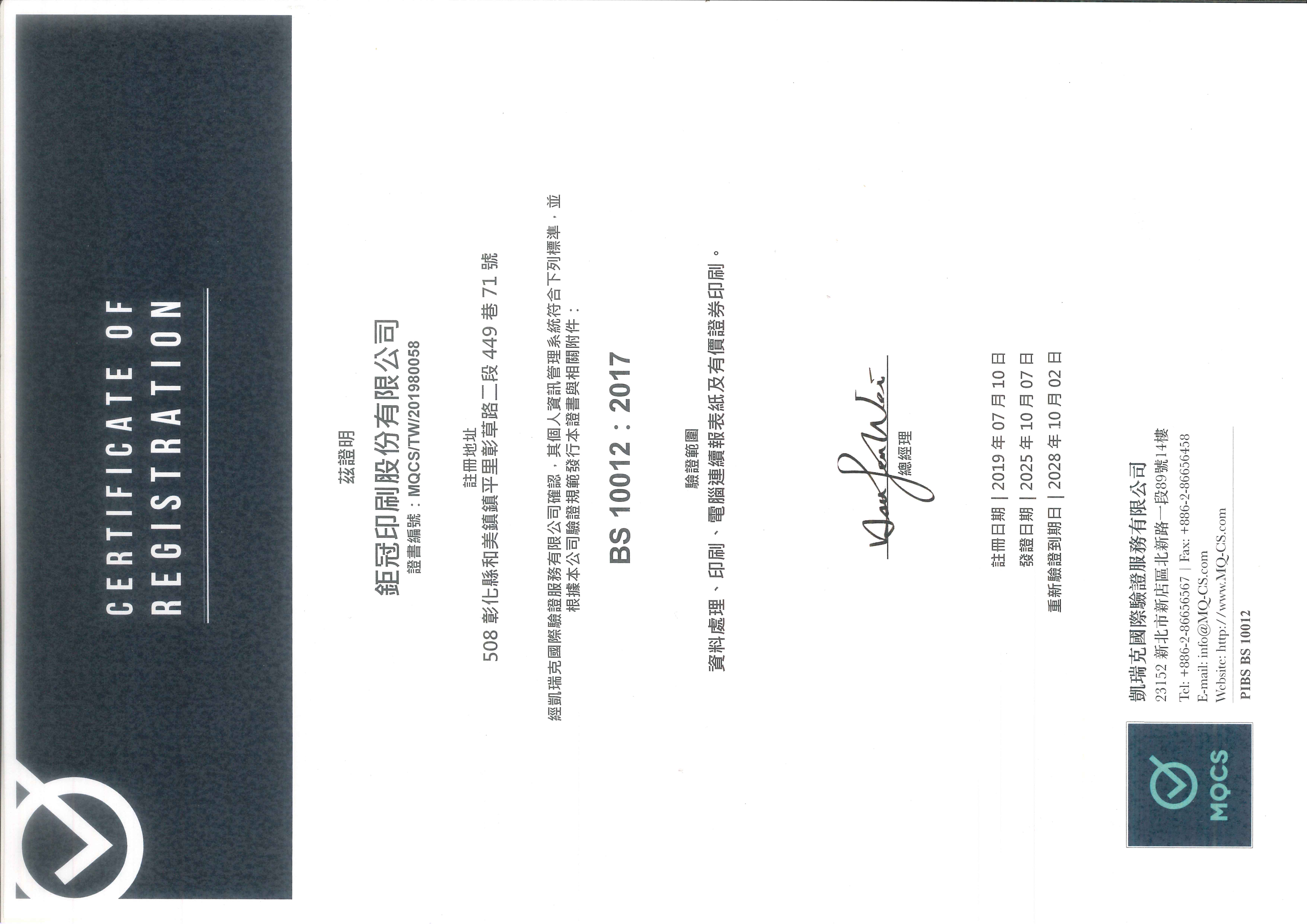 鉅冠印刷為了提升自本管理系統,也提供給客戶保證,不斷追求卓越,