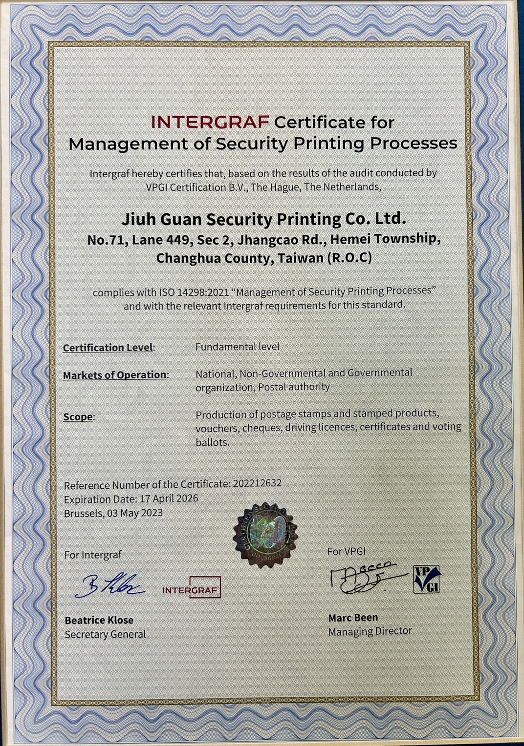 從2010年以來陸續取得多項認證,包含ISO9001品質管理認證、ISO27001資訊安全認證、BS10012個人資料管理認證(目前轉向ISO27701認證)以及ISO14298安全印刷認證。